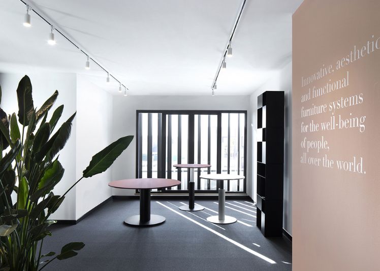 "Moving Color" is the design concept of Mara's newly designed showroom. The room offers impressive scenes and furnishing ideas with pastel nuances, colored contrasts and lighting effects. Visitors discover iconic and new products from the company in an elegant game of geometries and perspectives.