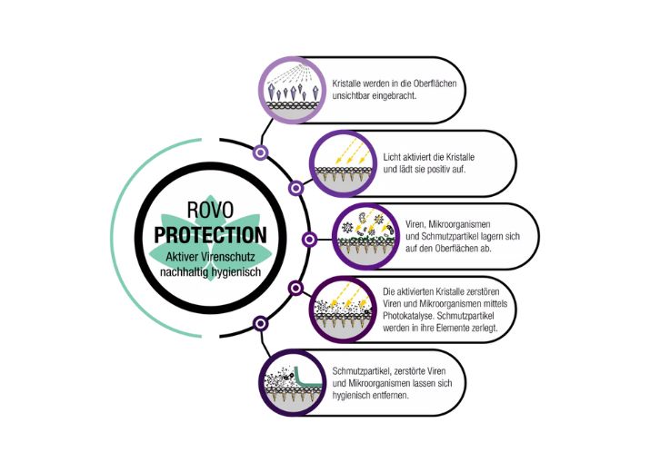 The hygiene system ROVO Protection sets new standards for cleanliness and security at the workplace. With innovative photocatalysis technology, the solutions touchafe ensure smooth surfaces and easyclean for upholstery for clean and antiviral contact surfaces. This technique effectively reduces bacteria and viruses and thus creates a hygienic environment that supports the well -being and health of the user.