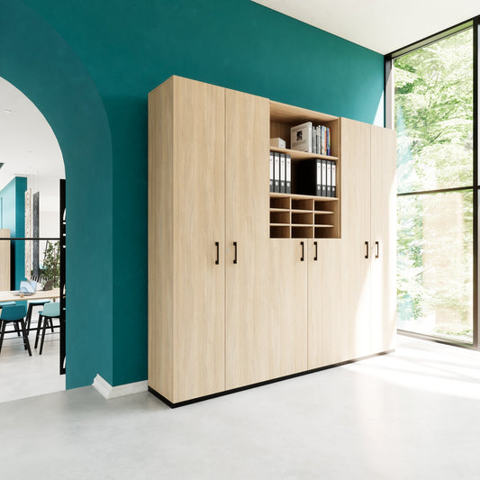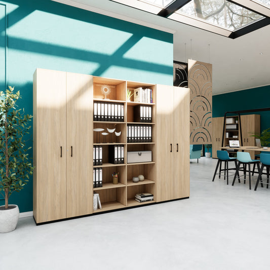 - Für den harten Büroalltag gemacht: Die CHOICE Schrankwand kombiniert Robustheit mit zeitlosem Design. Kratzer? Fehlanzeige dank Oberfläche mit Melaminharzbeschichtung. Licht und Wasser? Können Ihrem Schrank nichts anhaben. Die Kanten sind außerdem mit ABS verstärkt, was ihnen eine hohe Schlagfestigkeit verleiht und zusätzlichen Schutz vor Stößen bietet. Das Beste: Die 25 mm dicken Fachböden tragen mühelos bis zu 20 kg. Da wackelt nichts, egal wie voll die Schränke sind.