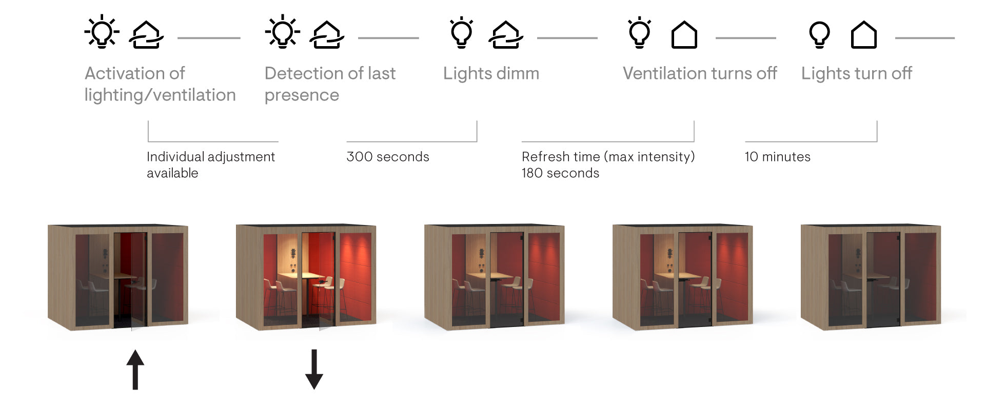 An intelligent control unit automatically activates optimal ventilation and lighting as soon as you enter the Silent Room. Then you can easily adjust both settings manually. If you leave the room, the control dimaps the light and switches off lighting and ventilation after some time - for minimal energy consumption without effort.