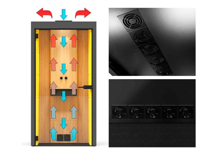 Working concentrated thanks to optimal air supply The Silent Room is equipped with an efficient ventilation system. The quiet and powerful fans ensure continuous fresh air supply - even with longer use. The SILENT ROOM L is equipped with 5 fans that deliver an output of 500 m³/h.