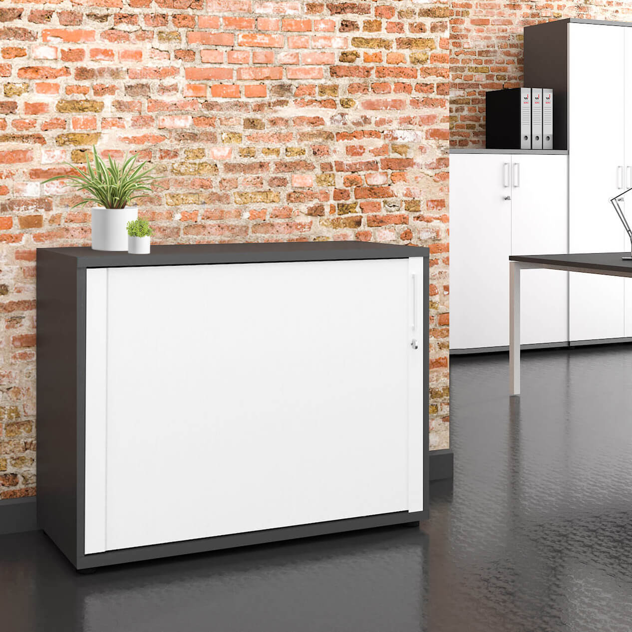 Discover the Professional cabinet in top quality from the series UNI With a 10 annual guarantee. This final and ideal sideboard offers you the optimal storage for folder and documents. With his Masses: Width: 1000 mm, depth: 425 mm, height: 777 mm - 2OH, it fits perfectly into your office. The cabinet is of high quality, with melamine resin coating and massive rear wall. The Corpus presents itself in elegant anthracite during the Roller shutters is kept in stylish white.
