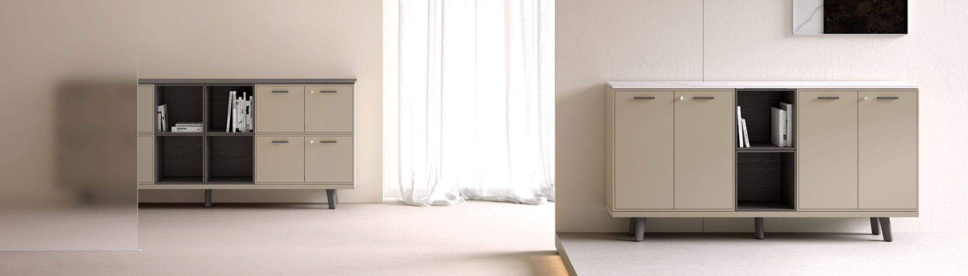 Les Highboards sont les plus grands des trois meubles, avec un Hauteur entre 120 cm et 160 cm. Ils offrent un vaste espace de stockage pour stocker de grandes collections de documents, des matériaux de bureau et même des appareils techniques en toute sécurité et clairement. Leur taille en fait des candidats idéaux pour la délimitation des zones de travail, en particulier dans les environnements de bureaux ouverts. Highboards peut servir de barrières visuelles efficaces et esthétiquement attrayantes en même temps sans bloquer complètement la communication dans la pièce.