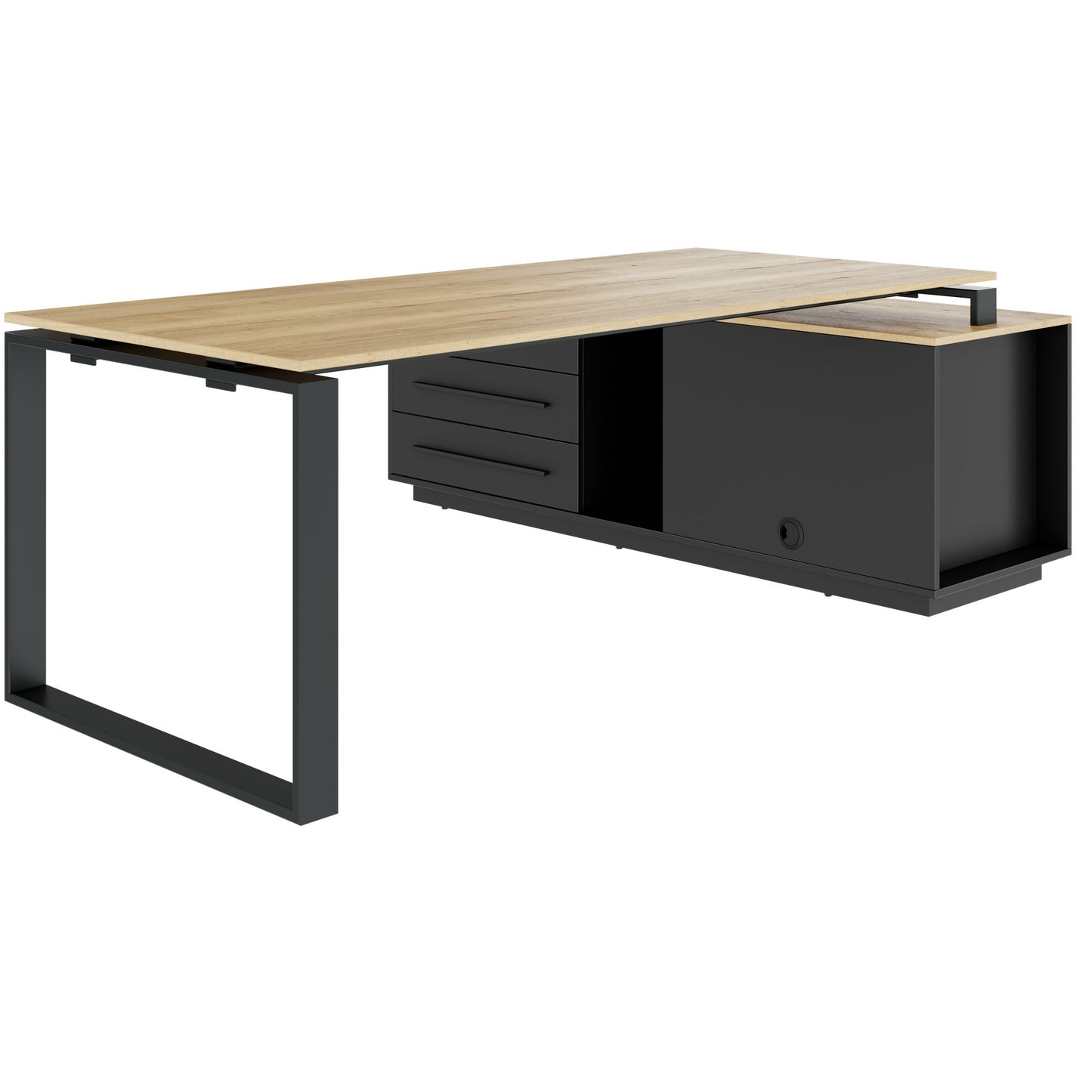 Entdecke den edlen Schreibtisch aus der Serie ART, der mit einem eleganten Designer-Fussgestell beeindruckt. Kombiniere ihn mit einem abschliessbaren Lowboard, das sowohl links als auch rechts montierbar ist. Die Tischplatten-Masse betragen 2000 x 900 mm mit einer Sitzhöhe von 740 mm und das Lowboard misst 1800 x 560 x 620 mm. Ein perfektes Design für einen stilvollen Arbeitsplatz!