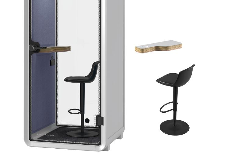 La cabine est livrée avec un tabouret de bar et une table qui sont conçues ergonomiquement pour travailler sur l'ordinateur portable sur la cabine téléphonique et pour les conférences de zoom et de conférence.