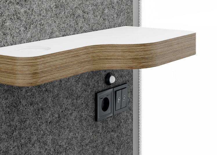 La cabine est déjà entièrement meublée: un tabouret de bar ergonomique avec un coussin de siège confortable et un cadre en acier stable ainsi qu'une table robuste en bois de bouleau multi-réparties avec un revêtement à feu incendie offrent le plus grand confort dans le plus petit espace. Il existe également une alimentation intégrée (100–240 V) avec une prise standard suisse ainsi que des connexions USB et USB Type-C. Vous avez donc tout ce dont vous avez besoin pour un travail concentré - dans une conception bien pensée.