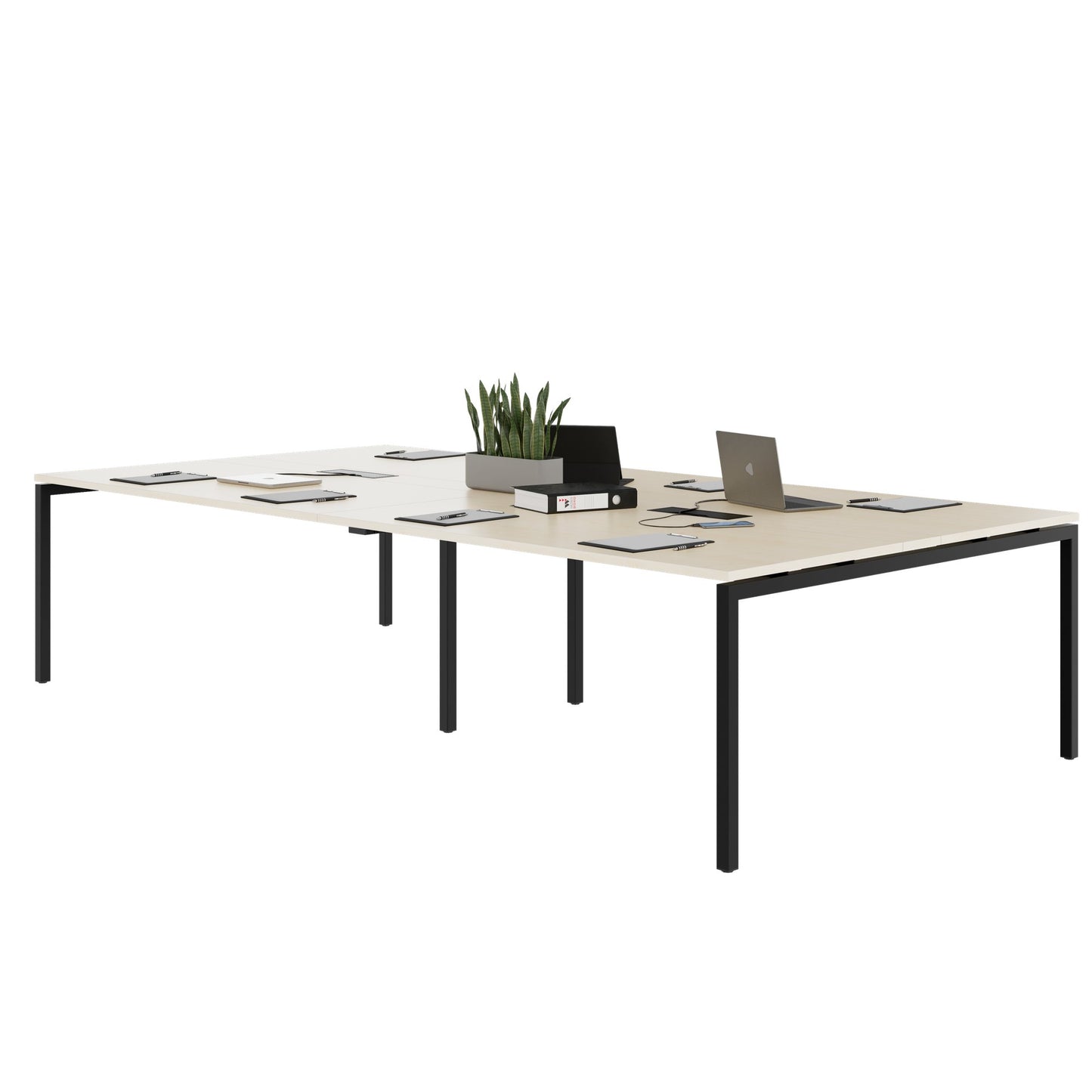 Les jambes en U se connectent quatre Fermes, qui donnent à la table sa stabilité. Corrigé comme un rocher dans le surf, rien oscille à cette table. Le cadre se compose de quatre canaux en acier Revêtement en poudre, ce qui donne au métal une surface lisse et résistante aux rayures. Les surfaces en bois sont recouvertes de Résine mélamine et avoir un tout Protection des bords Du plastique ABS. Pour protéger le bois des liquides, des rayures et des bosses.