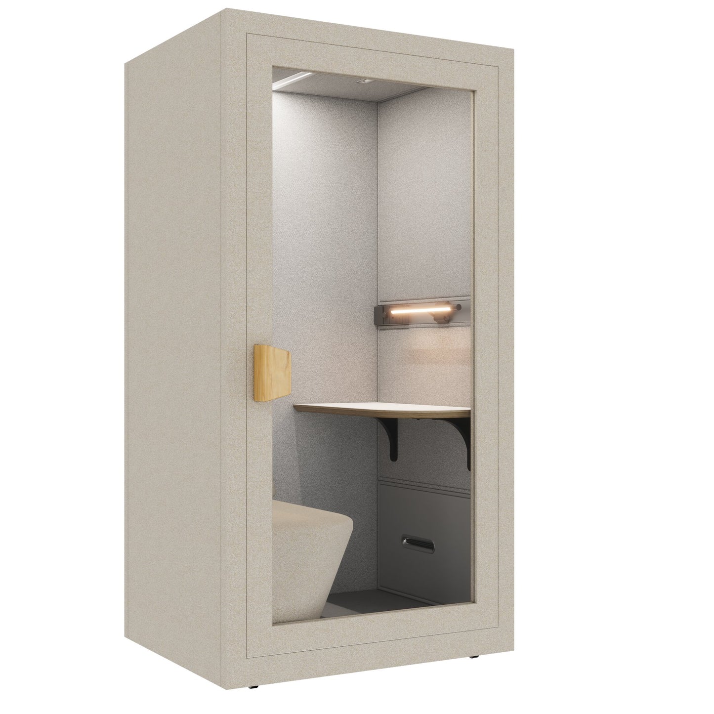 La cabine en offre une Isolation saine de jusqu'à 26 dB Selon ISO 717-1: 2020, le bruit ambiant se cache effectivement. À l'intérieur, la cabine téléphonique déguisée avec un tissu acoustique à fibre de fibre en polyester rembourré permet une atmosphère chaleureuse et Intelligibilité de la langue au niveau du studio (Sti a +).