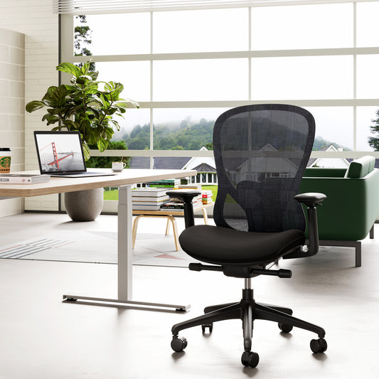 Ogni persona è diversa. Assicurati che la sedia da ufficio sia adatta alle tue misure corporee. I braccioli dovrebbero essere regolabili in altezza e l'altezza del sedile dovrebbe essere regolabile in modo che i tuoi piedi possano poggiare piatti sul pavimento. Se passi molto tempo alla scrivania, un meccanismo sincronizzato altamente flessibile è fondamentale per una seduta dinamica. Per gli utenti che desiderano lavorare occasionalmente in piedi, consigliamo una delle nostre scrivanie regolabili elettricamente in altezza, perfettamente abbinabili a una sedia da ufficio adeguata.