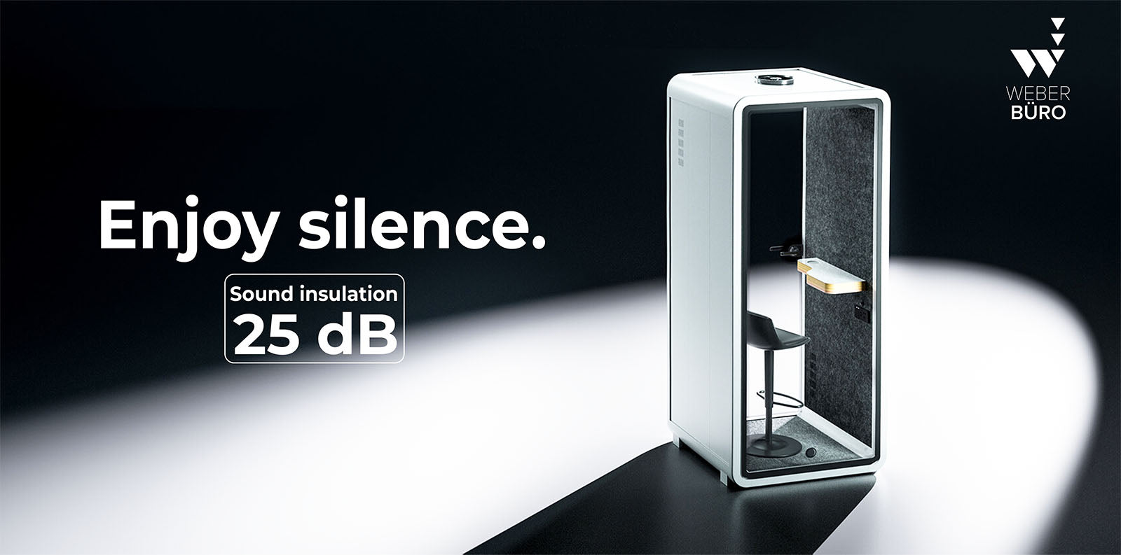 Il rumore in ufficio rende difficile il lavoro concentrato. La cassetta telefonica VR-S crea un ritiro silenzioso per conversazioni indisturbato o pause creative. Rampilare i pannelli delle pareti in fibra di carbonio, il vetro di sicurezza indurito e una cornice in alluminio nella qualità dell'aviazione riduce i rumori fino a 25 dB. VIBRAZIONE -Damping Feats prevenire i ponti acustici e ottimizzare l'isolamento sonoro.
