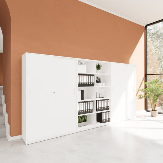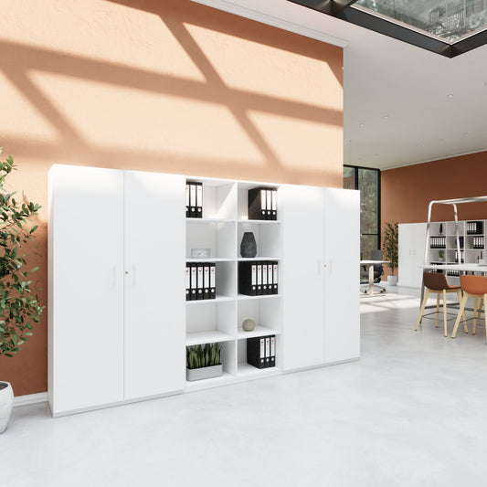 Entdecke die hochwertige Schrankwand unserer beliebten CHOICE Serie, die aus 2x Flügeltürenschrank und 1x offenem Regal besteht und dir jede Menge Stauraum für deine Unterlagen bietet.