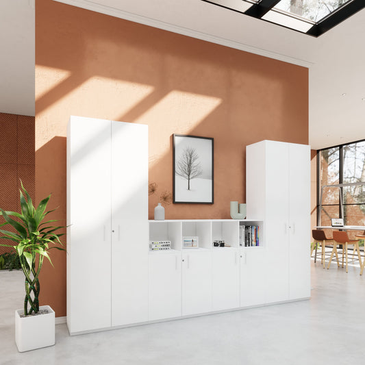 - Für den harten Büroalltag gemacht: Die CHOICE Schrankwand vereint Robustheit mit zeitlosem Design. Dank **Melaminharzbeschichtung** hat sie keine Angst vor Kratzern. Licht und Wasser? Kein Problem. Die Kanten mit ABS-Verstärkung bieten extra Schutz und Schlagfestigkeit, während die 25 mm dicken Fachböden bis zu 20 kg tragen – da wackelt nichts.