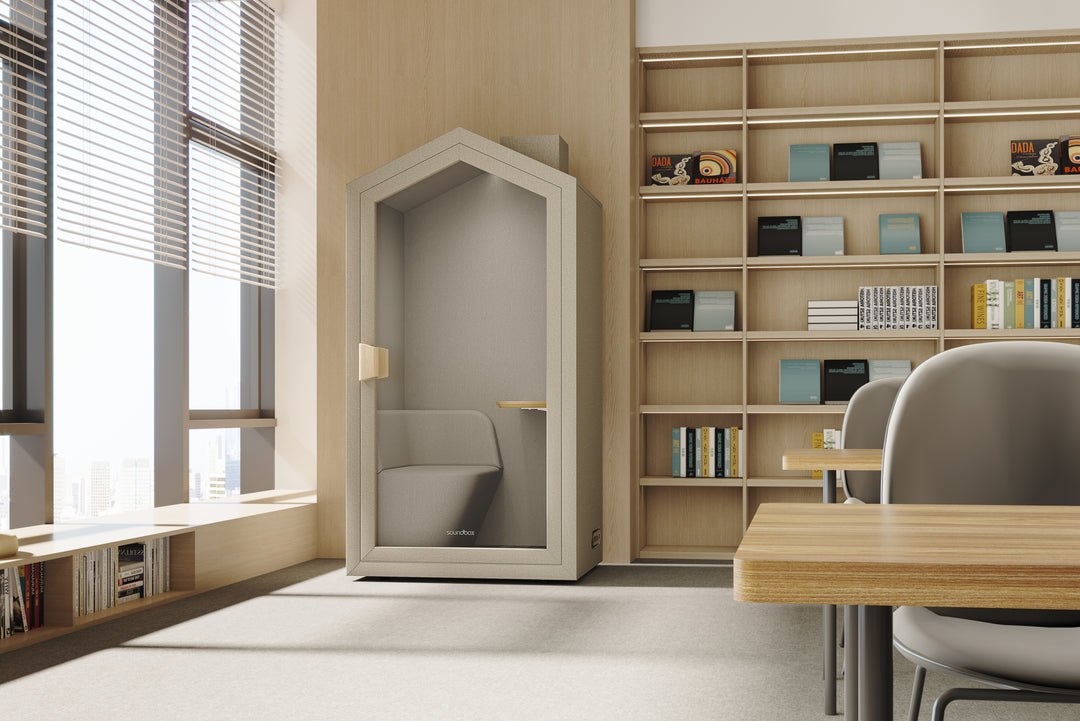 La cabina viene consegnata con un Minisofa, una scrivania e una lampada da lavoro progettata ergonomicamente per lavorare sul laptop, nella cabina telefonica e per i colloqui di zoom e conferenze.