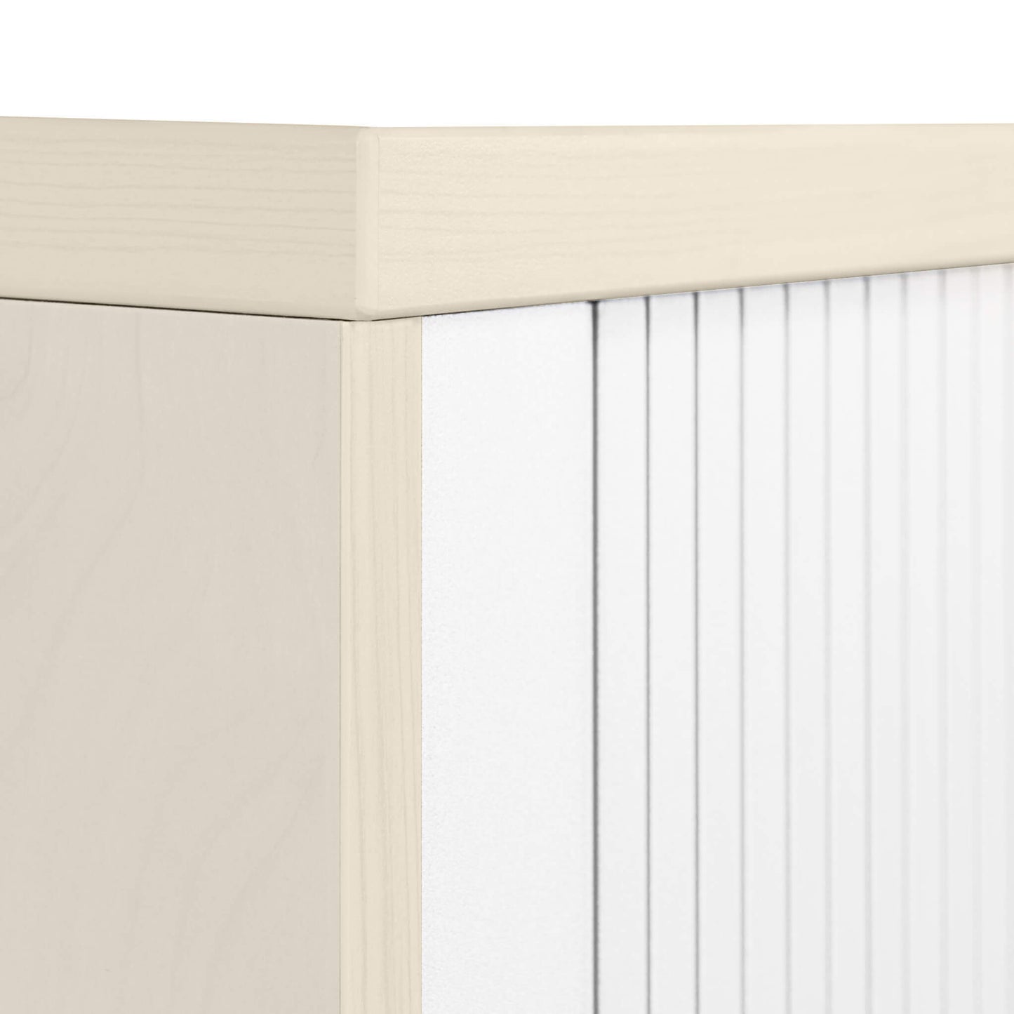Il carico a rulli incrociati scivola su binari di plastica e può essere aperto e chiuso senza intoppi e silenziosamente, anche nel caso di uno spazio più vicino. Per questo motivo, questa credenza è raccomandata come soluzione particolarmente efficiente della stanza. Un blocco cilindro integrato protegge i tuoi documenti dall'accesso non autorizzato. La moderna maniglia da stiro in metallo rivestito in polvere è stabile e arrotonda il design.