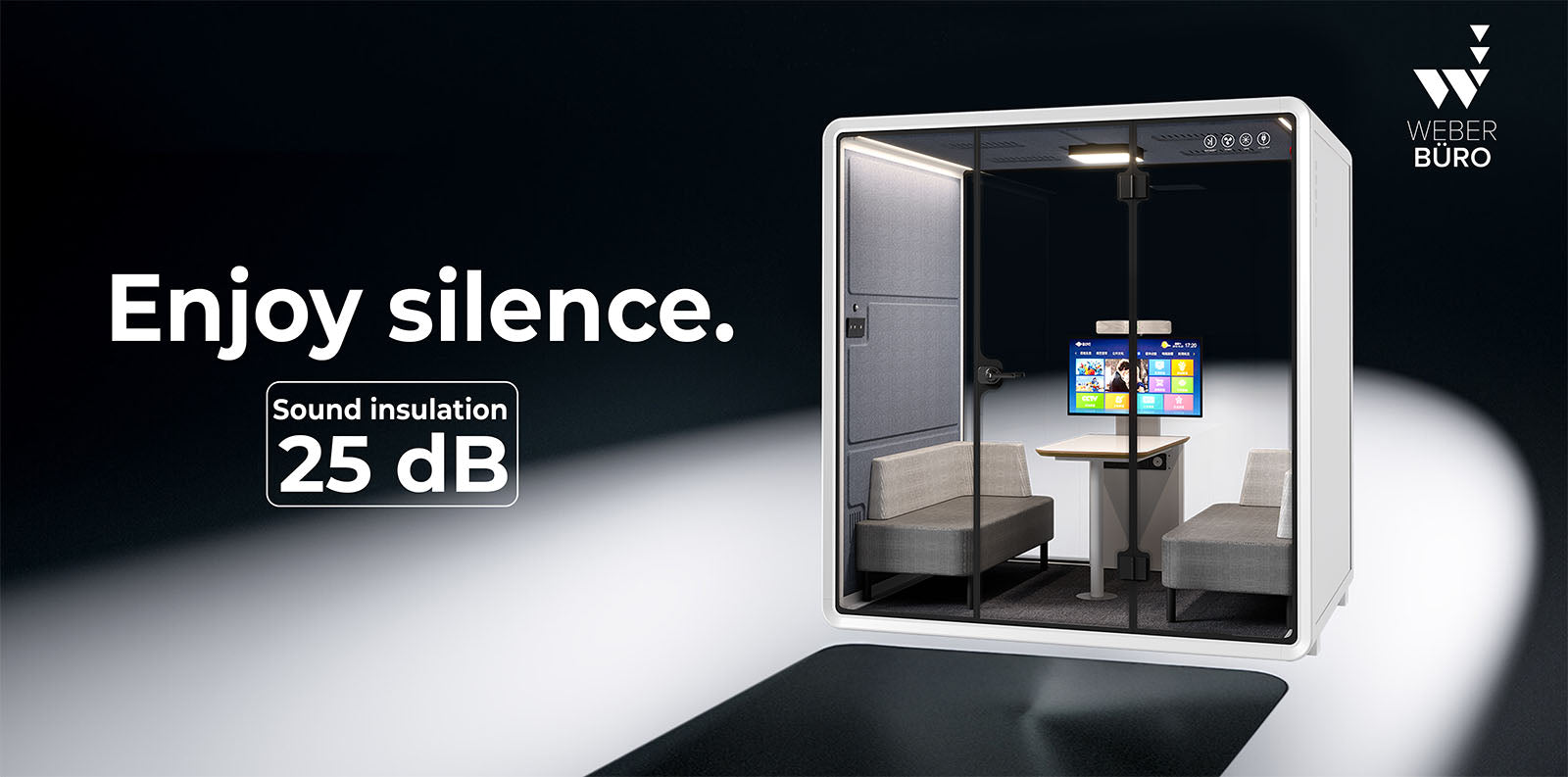 Negli uffici vivaci, manca spesso un luogo tranquillo per riunioni produttive: la riunioni VR-L risolve questo problema. Pannelli da parete in fibra di carbonio isolanti suoni, vetro di sicurezza induriti e un telaio in alluminio nella qualità dell'aviazione garantisce fino a 25 dB di isolamento sonoro e un tempo di riverbero di RT0,75 s (+0,1 s). Vibrazione: i piedi di detenzione prevengono i ponti acustici e migliorano l'isolamento.