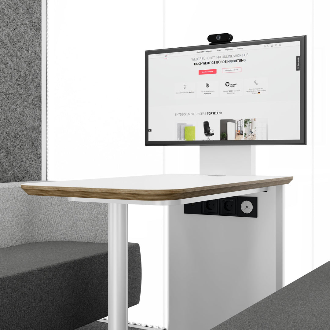 La cabina è già completamente arredata: un tavolo robusto fatto di legno di betulla a più livelli con un rivestimento a prova di fuoco e due comodi divani offrono il massimo comfort. C'è anche un alimentatore integrato (100–240 V) con una presa standard svizzera, nonché una connessione USB e di rete. Anche il titolare della TV è incluso. Questo ti dà tutto il necessario per un lavoro mirato - in un design ben pensato.