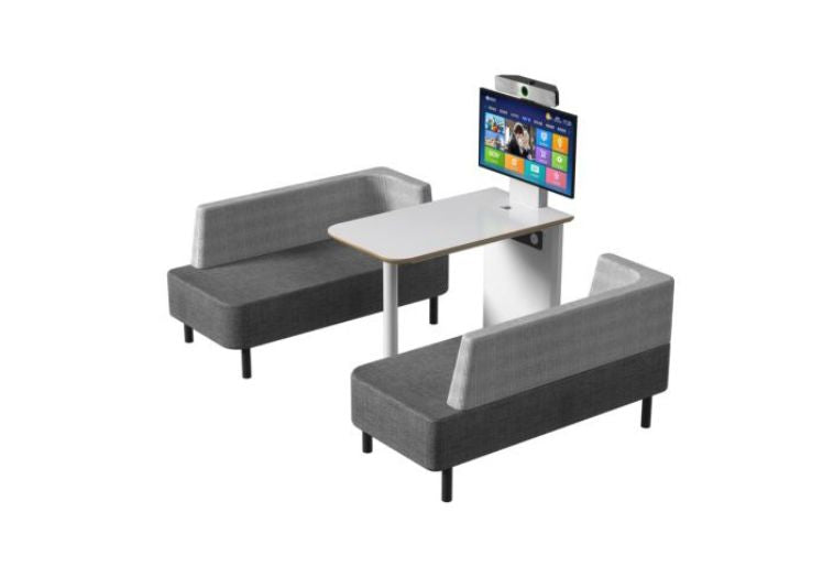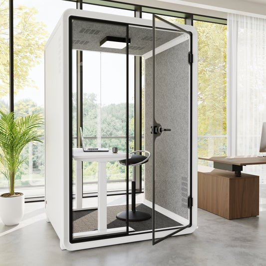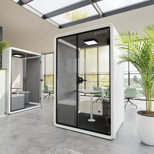 La cabina viene consegnata con un tavolo e due divani, progettati ergonomicamente per lavorare sul laptop nella cabina acustica e per i colloqui di zoom e conferenze.