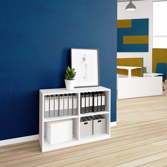 • Vier regale in Ordnerhöhe - Bietet Stauraum für kleinere Utensilien und dicke Wälzer.