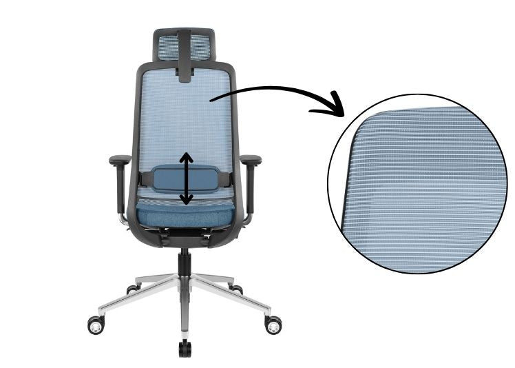 Dein Rücken verdient das Beste: Die Rückenlehne des FILO Bürodrehstuhls kombiniert ein atmungsaktives Netz in samtiger 3D-Webstruktur mit einem ergonomisch geformten Soft-Kontur-Rahmen. Das hält dich auch im Sommer angenehm kühl und sorgt gleichzeitig für die nötige Stabilität. Für noch mehr Komfort entlastet die höhenverstellbare, elastische und gepolsterte Lordosenstütze deine Wirbelsäule.