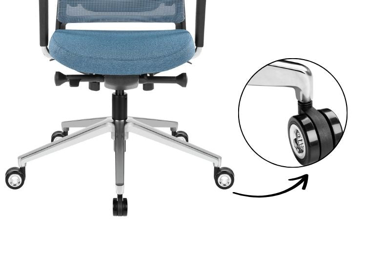 Das hochglanzpolierte Aluminium-Fusskreuz verleiht dem FILO eine edle Optik und sorgt für sicheren Stand in jeder Arbeitssituation. Dank der hochwertigen Universalrollen gleitet der Stuhl mühelos über harte und weiche Böden – ob Parkett, Teppich oder Fliesen. Die matt-schwarze Gasdruckfeder fügt sich nahtlos in das Design ein und sorgt für eine reibungslose Höhenverstellung.