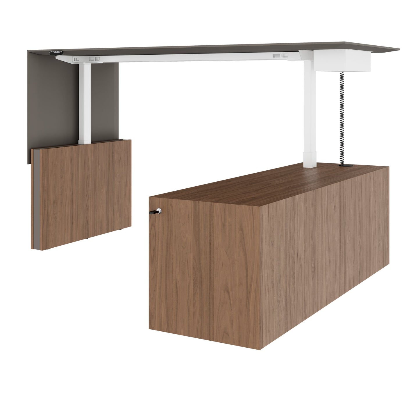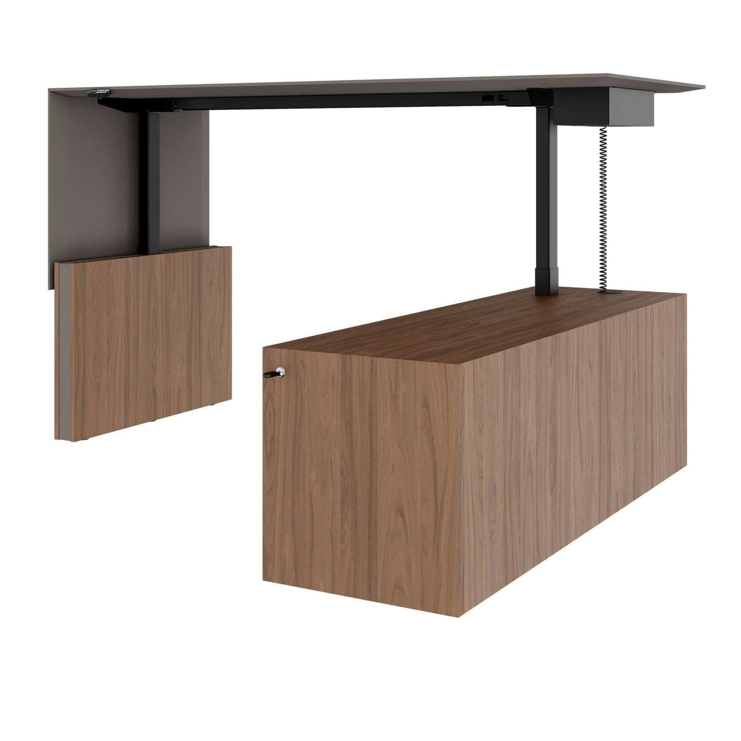 Erlebe den höhenverstellbaren Chefschreibtisch der Extraklasse mit einer beeindruckenden 10 Jahres-Garantie. Er verfügt über ein integriertes Sideboard mit abschliessbarer Schublade, das für Ordnung und Sicherheit sorgt. Ausgestattet mit zwei leistungsstarken LINAK-Motoren, bietet er eine sanfte Höhenverstellung dank Soft Start-Stopp-Mechanik und einem zuverlässigen Anti-Kollisionssensor. Mit der Memory-Funktion kannst du bis zu drei Lieblingshöhen speichern und so deine Arbeitsweise optimieren. Die vierfach-Steckdosenleiste, die elegant in die Tischplatte integriert ist, macht den Anschluss all deiner Geräte zum Kinderspiel.