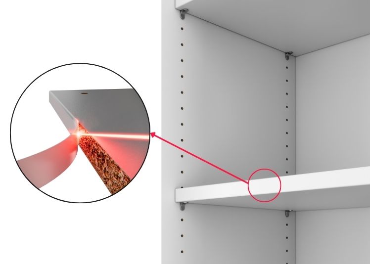 Die Kante wird durch ein Laserverfahren mit der Holzplatte verbunden. Dies ermöglicht eine fugenlose Integration, bei der alle Elemente nahtlos ineinander übergehen.