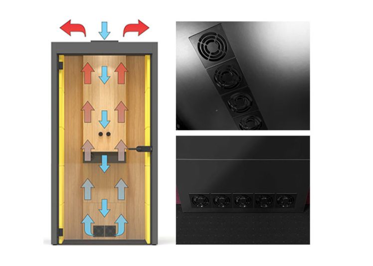 Konzentriert arbeiten dank optimaler Luftzufuhr Der Silent Room ist mit einem effizienten Belüftungssystem ausgestattet. Die leisen und leistungsstarken Ventilatoren sorgen für eine kontinuierliche Frischluftzufuhr – auch bei längerer Nutzung. Der Silent Room M verfügt über 4 Ventilatoren mit einer Leistung von 400 m³/h.