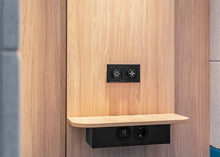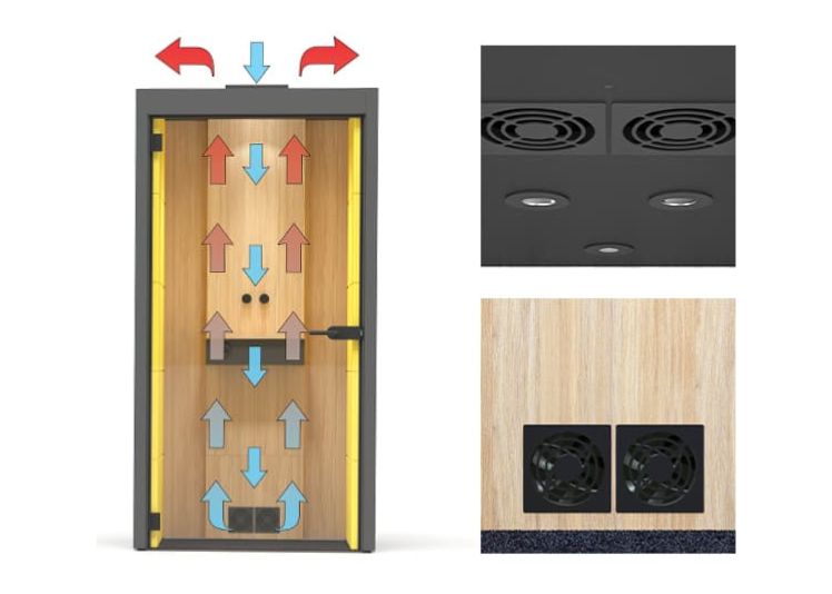 Der Silent Room ist mit einem effizienten Belüftungssystem ausgestattet. Die leisen und leistungsstarken Ventilatoren sorgen für eine kontinuierliche Frischluftzufuhr – auch bei längerer Nutzung. Der Silent Room S verfügt über zwei Ventilatoren mit einer Leistung von 200 m³/h.