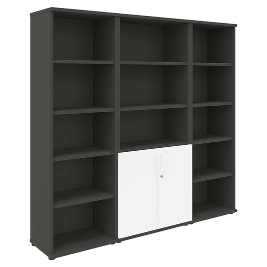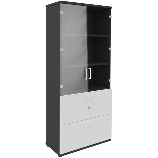 Entdecke diesen formschönen, hochwertigen Kombischrank. Mit einem Einlegeboden hinter den Türen und zwei offenen Einlegeböden bietet er viel Stauraum. Die Türen sind mit einem 3-Punkt-Schliesssystem versehen und damit sicher abschliessbar. Die Masse sind beeindruckend: Breite 800 mm, Tiefe 425 mm und Höhe 1897 mm (5OH). Der Korpus besticht in edlem Anthrazit, während Türen und Griffe in elegantem Weiss gehalten sind. Hol dir jetzt Funktionalität und Stil in einem Möbelstück!