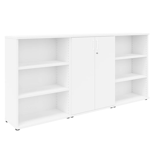 - Mittiger Kombischrank, links und rechts zwei offene Regalschränke