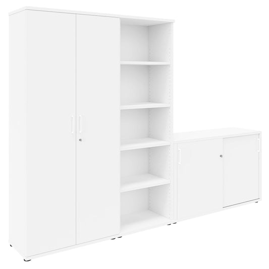 Entdecke den Aktenschrank in Top-Qualität aus der Serie UNI. Die Masse sind beeindruckend: Eine Breite von 2000 mm, eine Tiefe von 425 mm und eine Höhe von 1897 mm - 5OH. Sowohl der Korpus als auch die Front präsentieren sich in elegantem Weiss. Auch die Griffe sind stilvoll in Weiss gehalten. Der Schrank besteht aus einem vielfältigen Mix: Einem Kombischrank und zwei Regalschränken. Sichere dir jetzt dieses hochwertige Möbelstück für dein Büro!